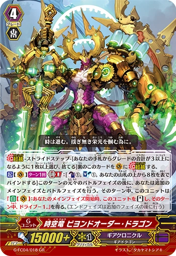 [ACT](VC)[1/Turn] Generation Break 8:[Counter Blast (1) & Soul Blast (1) & Bind eight cards from the top of your deck face up] After the original battle phase of this turn, you perform an additional main phase and battle phase, and until end of turn, this unit gets "[AUTO](VC):At the beginning of your main phase, [Stand] this unit, and it gets drive -1 until end of turn.". (Perform the end phase after the additional phase)