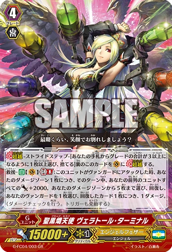 [AUTO](VC) Generation Break 8:[Counter Blast (1)] When this unit attacks a vanguard, you may pay the cost. If you do, search your deck for up to five cards, call them to separate (RC), and until end of turn, they get [Power]+4000, and this unit gets [Critical]+1. Shuffle your deck.