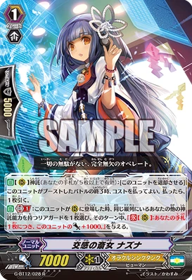 [AUTO]:[Choose one of your rear-guards with "Maiden of" in its card name, and [Rest] it] When this unit is placed on (RC), you may pay the cost. If you do, choose up to four "Maiden of Grow Shine" on your (RC), and they get [Power]+3000 until end of turn. Then, for each face up grade 4 card with "Maiden of" in its card name on your (VC) or G zone, all of the chosen units with this effect get [Power]+3000 and "Boost" until end of turn.