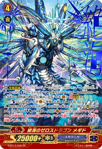Nowe Dodatki / Odp: G Booster Set 13: Ultimate Stride« dnia: Października 24, 2017, 08:33:49 pm »Ultimate Stride !!!!!!! Zeroth Dragon of Distant Sea, Megiddo ![]() Card Effect(s) [Ultimate Stride] (Released when the number of face up cards in your G zone is three or more! When it would return to your G zone, exclude your G zone!)-Stride Step-[Choose a card with the same card name as your vanguard, and discard it] Stride this card on your (VC) from face down. [AUTO]:[Counter Blast (2)] When this unit is placed on (VC), you may pay the cost. If you do, choose up to five cards in total from your hand and drop zone, call them to separate (RC), until end of turn, they get [Power]+5000, and "[AUTO](RC):At the end of the battle that this unit attacked, choose one of your other rear-guards, and you may exchange positions with this unit." Blue Wave Marshal, Valeos ![]() [AUTO](VC):[Counter Blast (1)] At the beginning of your ride phase, you may pay the cost. If you do, choose up to one card with "Blue Wave" in its card name from your hand, call it to (RC), and it gets [Power]+2000 until end of turn. If you called a card, draw a card. [AUTO](VC):[Soul Blast (1)-card with "Blue Wave" in its card name] When your G unit with "Blue Wave" in its original card name Stride, you may pay the cost. If you do, until end of turn, choose one of your opponent's vanguards, until end of turn, its [Power] increase or decrease to 11000, and its [Power] cannot increase or decrease other than with this effect or the [Shield] of the guardians. Blue Wave Marshal Dragon, Flood Hazard Dragon ![]() [AUTO](VC):[Counter Blast (1) & Choose a face down card from your G zone with the same card name as this unit, and turn it face up & Choose two cards from your hand, and discard them] At the end of the battle that your rear-guard with "Blue Wave" in its card name attacked, if you have a heart card with "Blue Wave" in its card name, and it is the fourth battle of this turn, you may pay the cost. If you do, [Stand] this unit, and it gets drive-3. [CONT](VC) Generation Break 3:This unit gets drive+1, and all of the rear-guards with "Blue Wave" in their card names in your front row get [Power]+2000. Blue Wave Lance Corporal, Beragios ![]() Card Effect(s) [AUTO]:When this unit is placed on (RC) from hand, look at seven cards from the top of your deck, search for up to one "Blue Wave Marshal, Valeos" from among them, reveal it, put it into your hand, and shuffle your deck. If you put a card into your hand, choose one or more cards with the sum of their grades being 3 or greater from your hand, and discard them. [AUTO](RC):When your vanguard with "Blue Wave" in its card name [Stand], [Stand] this unit. Blue Wave Marine General, Medora ![]() [CONT](RC):Resist (This unit cannot be chosen by the effects of your opponent's cards) [CONT](RC) Generation Break 1:If you have a vanguard with "Blue Wave" in its card name, this unit gets "[CONT](RC):This unit can attack from the back row." and "[AUTO](RC):When this unit attacks a vanguard from the back row, this unit gets [Power]+3000 until end of that battle.". Blue Wave Dragon, Arsenal-fleet Dragon ![]() [AUTO](RC)[1/Turn] Generation Break 1:[Counter Blast (1)-card with "Blue Wave" in its card name] When this unit attacks, you may pay the cost. If you do, this unit gets [Power]+4000 until end of turn, and if it is the second battle of this turn, [Stand] this unit. [AUTO](Drop Zone):[Soul Blast (1)] When your vanguard with "Blue Wave" in its card name [Stand] due to an effect from one of your cards, you may pay the cost. If you do, return this card to your hand. :: [Ultimate Stride] (Released when the number of face up cards in your G zone is three or more! When it would return to your G zone, exclude your G zone!):: :: Ultimate Stride - kiedy w G zonie masz 3 lub więcej kart odkrytych! kiedy jednostka ZR wraca do g zone to g zone przestanie już istnieć to oznacza jak przeciwnik obroni się i masz deck który działa na stride to masz (łagodnie znaczenie) kłopoty :/ ps: cena Zeroth Dragon of Distant Sea, Megiddo na tą chwile £35.80 110