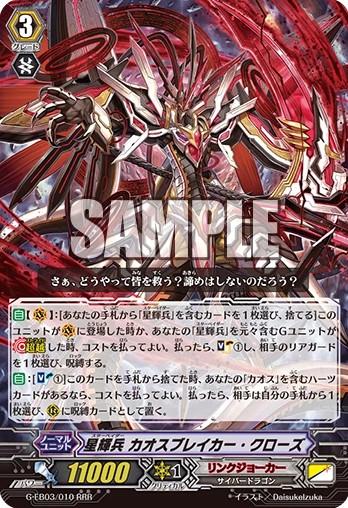 Zeroth Dragon of Destroy Star, Stark  [Ultimate Stride] (Released when the number of face up cards in your G zone is three or more! When it returns to the G zone, remove your G zone!)-Stride Step-[Choose a card with the same card name as your vanguard, and discard it] Stride this card on your (VC) from face down. [AUTO]:[Counter Blast (2)] When this unit is placed on (VC), you may pay the cost. If you do, until end of turn, this unit gets drive -2, this unit does not [Rest] for attack, and it can attack up to three times during this turn Star-vader, Chaos Breaker Close  [AUTO](VC):[Choose a card with "Star-vader" in its card name from your hand, and discard it] When this unit is placed on (VC), or when your G unit with "Star-vader" in its original card name Stride, you may pay the cost. If you do, Soul Charge (1), choose one of your opponent's rear-guards, and lock it. [AUTO]:[Soul Blast (1)] When this card is discarded from hand, if you have a heart card with "Chaos" in its card name, you may pay the cost. If you do, your opponent chooses a card from his or her hand, and puts it on (RC) as a locked card