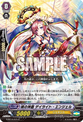 no jo , chcą stworzyć wielkie emocje i im się nie udało XD ( a tak serio odc są takie sobie , najlepszy temat na fabułę mają , ale niektóre odc powinny bardziej rozwinąć np: odc 7 pokazali szybkie slajdy walk zamiast ciekawych z wątkiem walki chętnie bym zobaczył jak jamie vs leon itp , oni za bardzo do przodu idą z odc wedłóg mnie Gyze by mógł pojawić jakoś po 26-27 odc a tu co już w 14 jej ) Goddess of Compassion, Inanna  [AUTO]:Revelation-(VC) [ACT](VC)[1/Turn]:[Counter Blast (1) & Choose a face down card from your G zone with the same card name as this unit, and turn it face up] Soul Charge (3), your opponent chooses one of his or her rear-guards for each card with the revelation ability that was Soul Charge, and retires it. [CONT](VC) Generation Break 3:All of your rear-guards get [Power]+2000 for each card with the revelation ability in your soul. Goddess of Karmic Wind, Ningal  [AUTO]:Revelation-(VC/RC) (When this unit is placed on the specified circle, look at the top card of your deck, and you may put that card into your soul. If you do, [Rest] one of your [Stand] rear-guards) [CONT](VC/RC):If a card was not put into your soul due to a card effect during this turn, this unit cannot attack a vanguard. Wertiger Plunderer [CONT](RC) Darkness (This ability is active if cards have been put into your soul during this turn):During your turn, if you have a vanguard with "Scharhrot" in its card name, this unit gets [Power]+1000 for each card in your soul.
