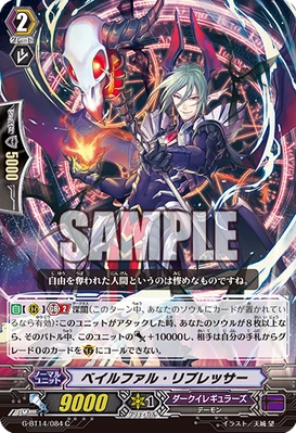 One who Hunts Souls, Balaam [ACT](VC)[1/Turn]:[Counter Blast (1) & Choose a face down card from your G zone with the same card name as this unit, and turn it face up] Choose one of your opponent's rear-guards, this unit gets that unit's [Power], and drive +1. Retire that unit. You may Soul Charge (2) for each face up card in your G zone. [CONT](VC) Generation Break 3 Darkness:If the number of cards in your soul is thirteen or more, your opponent cannot call grade 1 cards from hand to (GC). Insulation Fallen Angel, Akrasiel [CONT]:Sentinel [AUTO]:[Choose a card from your hand, and put it into your soul] When this unit is placed on (GC) from hand, you may pay the cost. If you do, choose one of your units with the darkness ability, and it cannot be hit until end of that battle. [ACT](Drop Zone) Generation Break 2 Darkness (This ability is active if cards have been put into your soul during this turn):[Counter Blast (1) & Choose another "Insulation Fallen Angel, Akrasiel" from your soul or drop zone, and bind it face up] Return this card to your hand. Baleful Repressor [AUTO](RC) Generation Break 2 Darkness (This ability is active if cards have been put into your soul during this turn):When this unit attacks, if the number of cards in your soul is eight or more, until end of that battle, this unit gets [Power]+10000, and your opponent cannot call grade 0 cards from hand to (GC). Crimson Lotus Ultimate Regalia, Muspel  [ACT](VC)[1/Turn]:[Choose a face down card from your G zone, turn it face up] Soul Blast any number of cards, choose one of your rear-guards for each card Soul Blast, and they get [Power]+4000 until end of turn. If you Soul Blast three or more cards, draw a card, or Counter Charge (1). Ultimate Regalia of Affection, Eir  [AUTO]:When this unit is placed on (GC), choose up to four cards with different grades from your drop zone, and put them into your soul. If you put two or more cards this way, until end of that battle, this unit gets [Shield]+5000, then, if you put four or more cards, this unit gets [Shield]+10000. Regalia of Epicenter, Kukurihime  [ACT](RC):[Put this unit into your soul] If you have a grade 3 or greater vanguard, choose one of your units, and it gets [Power]+3000 until end of turn. If you have a face up card in your G zone, draw a card. Dark Dragon, Dark Veil Dragon  [AUTO]:[Soul Blast (1)] When this unit is placed on (GC), you may pay the cost. If you do, this unit gets [Shield]+5000 until end of that battle for every two grade 1 cards in your drop zone. Slap-tail Dragon  [AUTO](RC) Ritual 3 (Active if there are three or more grade 1 cards in your drop zone):When your other grade 1 unit is placed on (RC), if you have a vanguard with the ritual ability, the unit that was placed and this unit get [Power]+3000 until end of turn. [CONT](Deck/Drop Zone):If you have a grade 4 vanguard with "Luard" in its card name, this card gets grade -1. Pulsar, Merry Block Dragon [CONT](Deck/Drop Zone):If your vanguard is grade 3 or greater, this card gets grade +2. [AUTO](RC) Generation Break 1:When this unit boosts, you may have this unit get [Power]+2000 for each of your other <Zodiac Time Beast> units until end of that battle. If you do, at the end of that battle, bind this unit face up.
