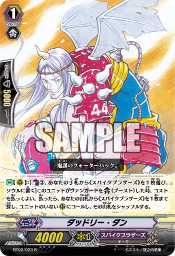 AUTO [(VC)] [Limit Break 4] (Active when you have 4 or more damage): [Counter-Blast 2, choose two <Spike Brothers> from your hand, and send them to Soul] When this unit attacks a vanguard, you may pay the cost. If you do, search for up to two <Spike Brothers> from your deck, call them to separate empty (RC), and shuffle your deck.